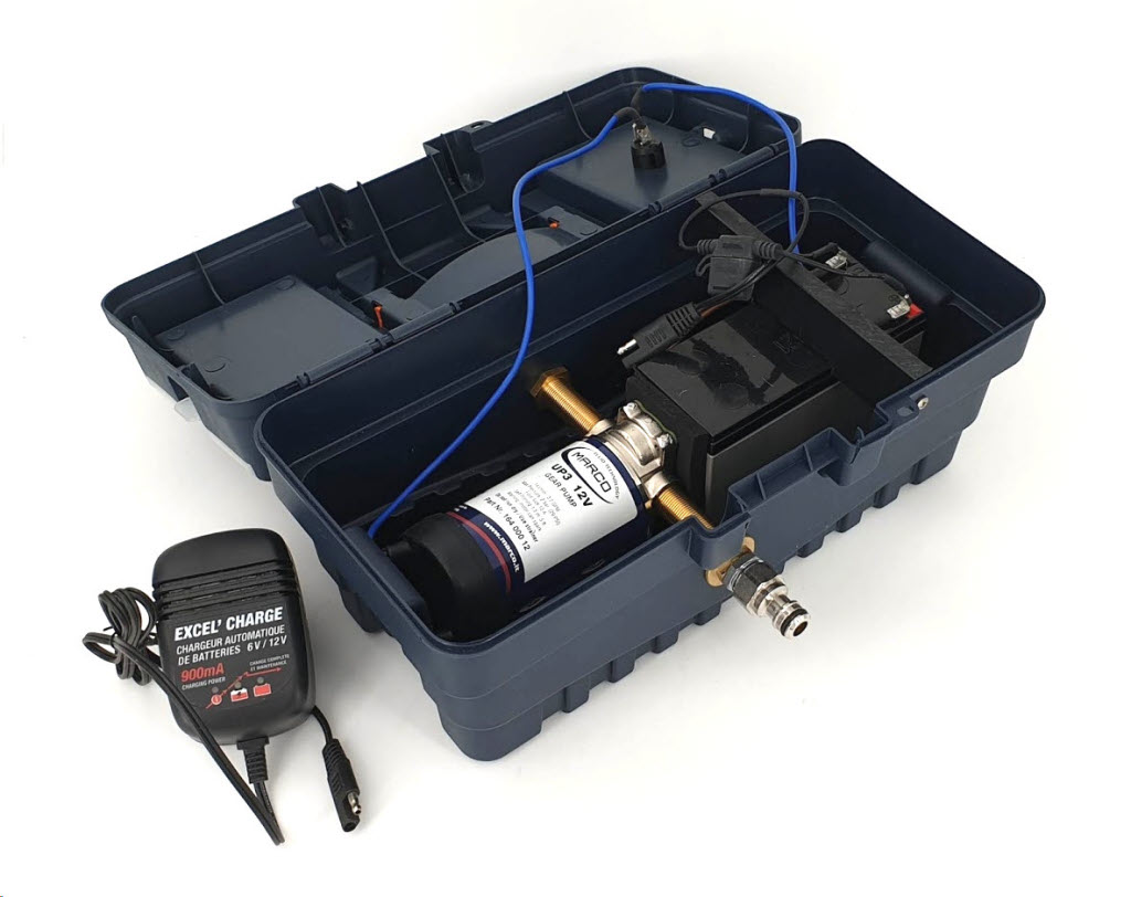 Pompe éléctrique installée dans une caisse plastique, facile à transporter.