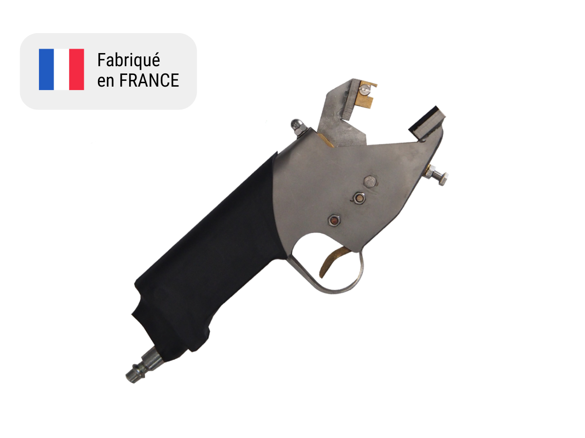Un vérin, situé dans une coque en inox, actionne une tête articulée ou sont fixés les caractères venant marquer l’oreille. Deux options pour réaliser le tatouage : le tatoueur en main ou en poste fixe pour avoir les deux mains libres et contenir les porcelets plus facilement. Dans se second cas, une pédale pneumatique posée au sol est le déclencheur de la tête porte caractères.